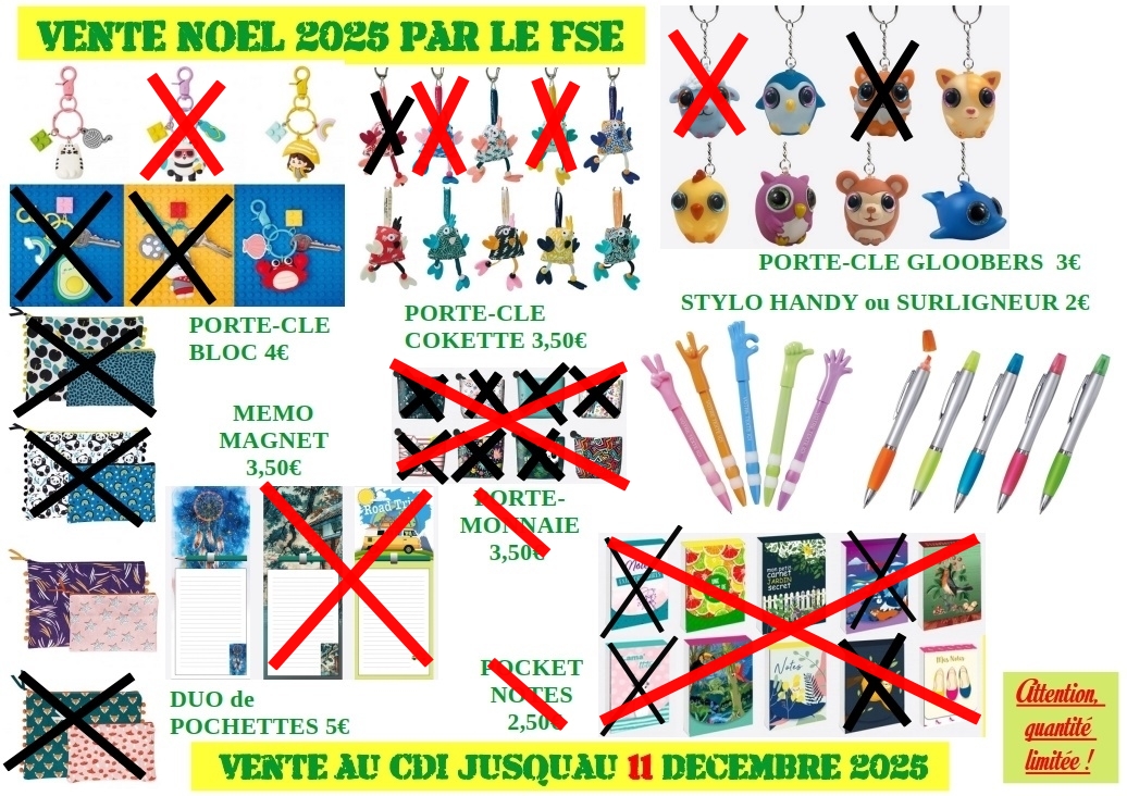 La vente se fera par bon de commande à remplir et à apporter au CDI (avec le règlement). La commande sera ensuite préparée et donnée à l'élève. Le stock sera mis à jour chaque soir. Attention, les produits en vente sont en très petite quantité !