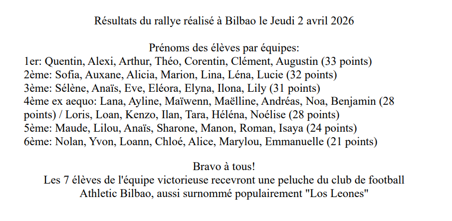 Publication des résultats d'une épreuve réalisée durant le voyage en Espagne le Jeudi 2 avril 2026 et pour laquelle les élèves victorieux ont d'ores et déjà reçu leur récompense...
