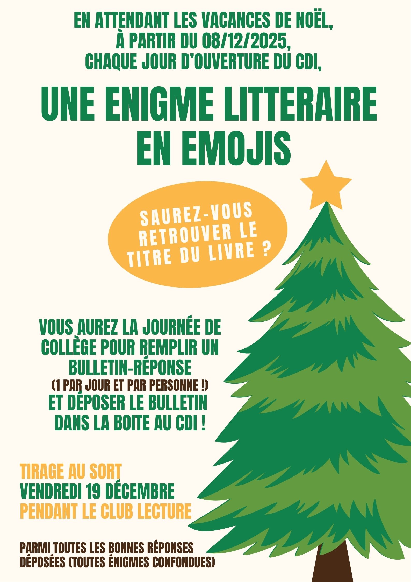 A partir du 08/12/2025, CHAQUE JOUR D’OUVERTURE DU CDI, une ÉNIGME LITTÉRAIRE en ÉMOJIS est proposée. Vous aurez la journée de collège pour remplir un bulletin-réponse (1 par jour et par personne !) Et déposer le bulletin dans la boite au CDI !