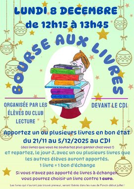 Par AGNES CORNE, publié le lundi 8 décembre 2025 15:30 - Mis à jour le lundi 8 décembre 2025 15:30Les élève du club lecture organise une Bourse d'Echange de Livres, ouvert à tous ! Apportez un ou plusieurs de vos livres avant le 5 décembre au CDI et repartez avec de nouveaux livres trouvés à la Bourse aux Livres ! -